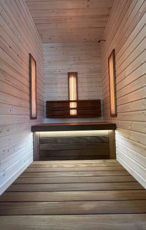 A szárított szerkezetanyagból épített váz hőtükrös alukasírozott szigetelőanyaggal van bélelve. A falakba szilikon vezetékeket és zárható szellőzőnyílásokat helyezünk. A kabin kívül-belül szaunalambéria burkolatot kap, amelyből hétféle változat közül választhat. Az ajtó 8 mm vastag bronzszínű tele üvegajtó, amelyhez alumínium zsanérok tartoznak.
